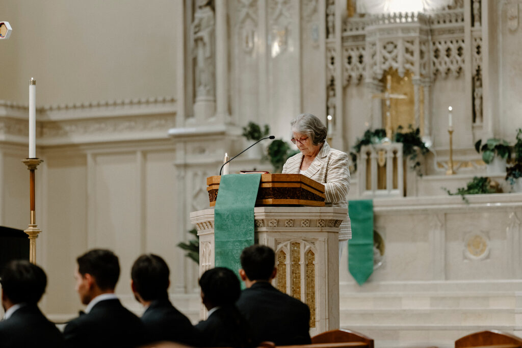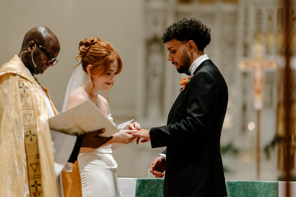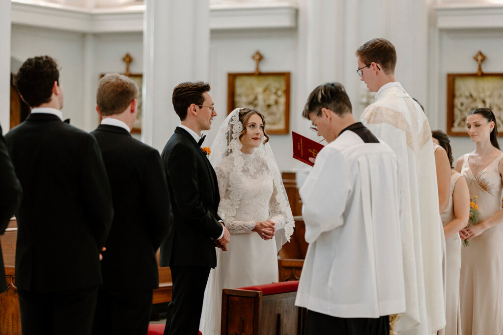 Now let’s move on to the Mass – the most important part of the day. One perk of hiring a Catholic Wedding Photographer is that you know they have done Catholic Weddings before. This means, in most cases, they know how to photograph important moments while respecting the sacredness of the Mass. You also won’t be stressed about them missing a special moment. Catholic photographers, such as myself, have a sort of “routine” when it comes to photographing weddings. They know generally where they should stand to get a good angle of the procession, sign of the cross, blessing of the rings, the Consecration, offering flowers to Mary, and the show-stopping first kiss.
