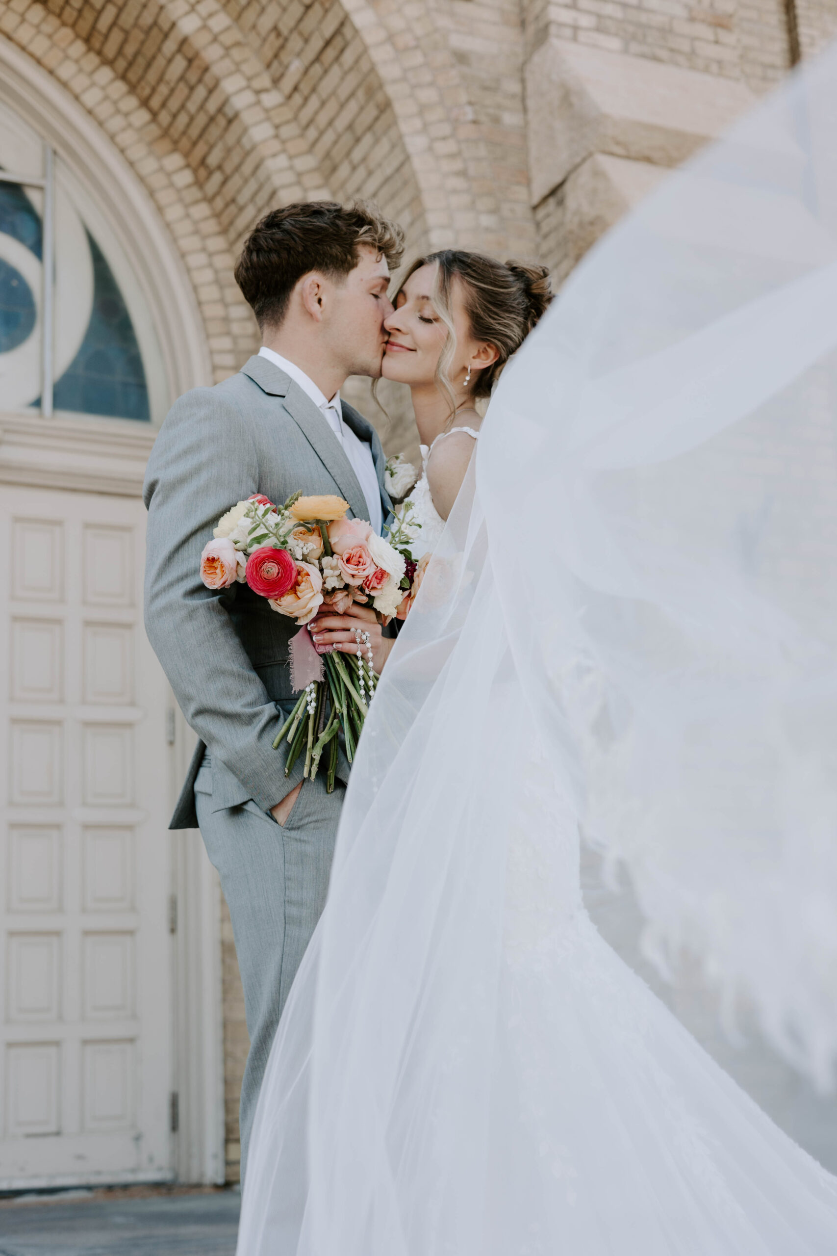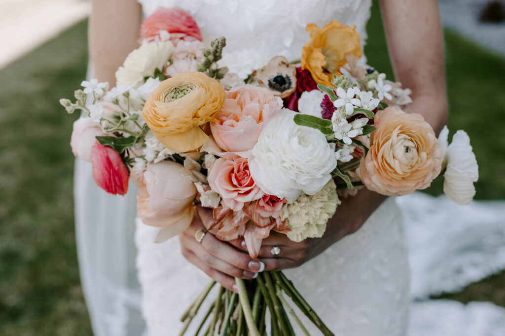 Brittney really wanted light spring colors for her bouquets. We went for peaches, light pinks, whites, and baby yellows. Cole’s boutonniere was simple, but perfectly traditional.